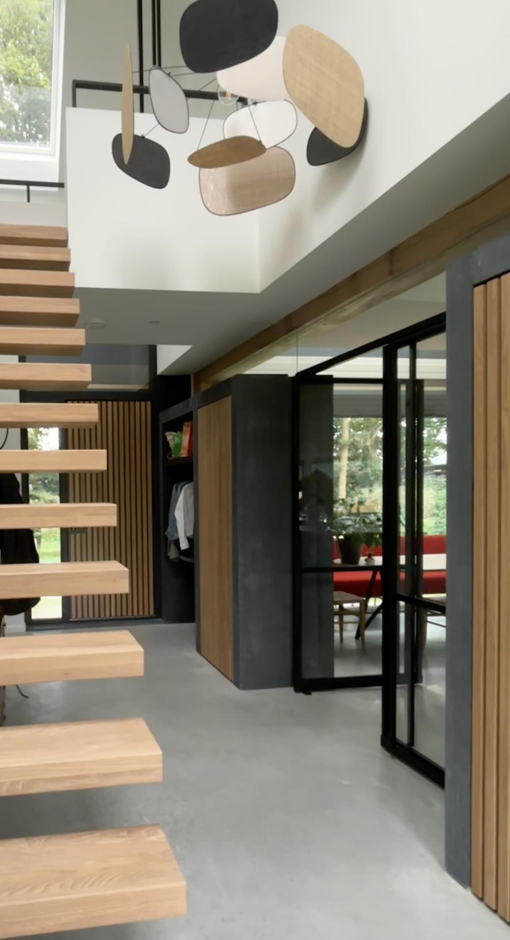 Op de plaats van een losse woning met schuren komt op de plaats van de hoofdschuur een moderne schuurwoning terug. Hierdoor komt de molen in beeld en wordt de entree van het dorp verbeterd. Aan de straatzijde een passende gesloten schuurgevel. In het midden van de woning, gemarkeerd door een doorlopende betonnen wand, de entreepartij. Daarachter opent de woning zicht steeds verder, waarbij de diverse woonruimten - verbonden door een klassiek eiken gebint - allemaal op een eigen manier contact hebben met het landschap rondom.