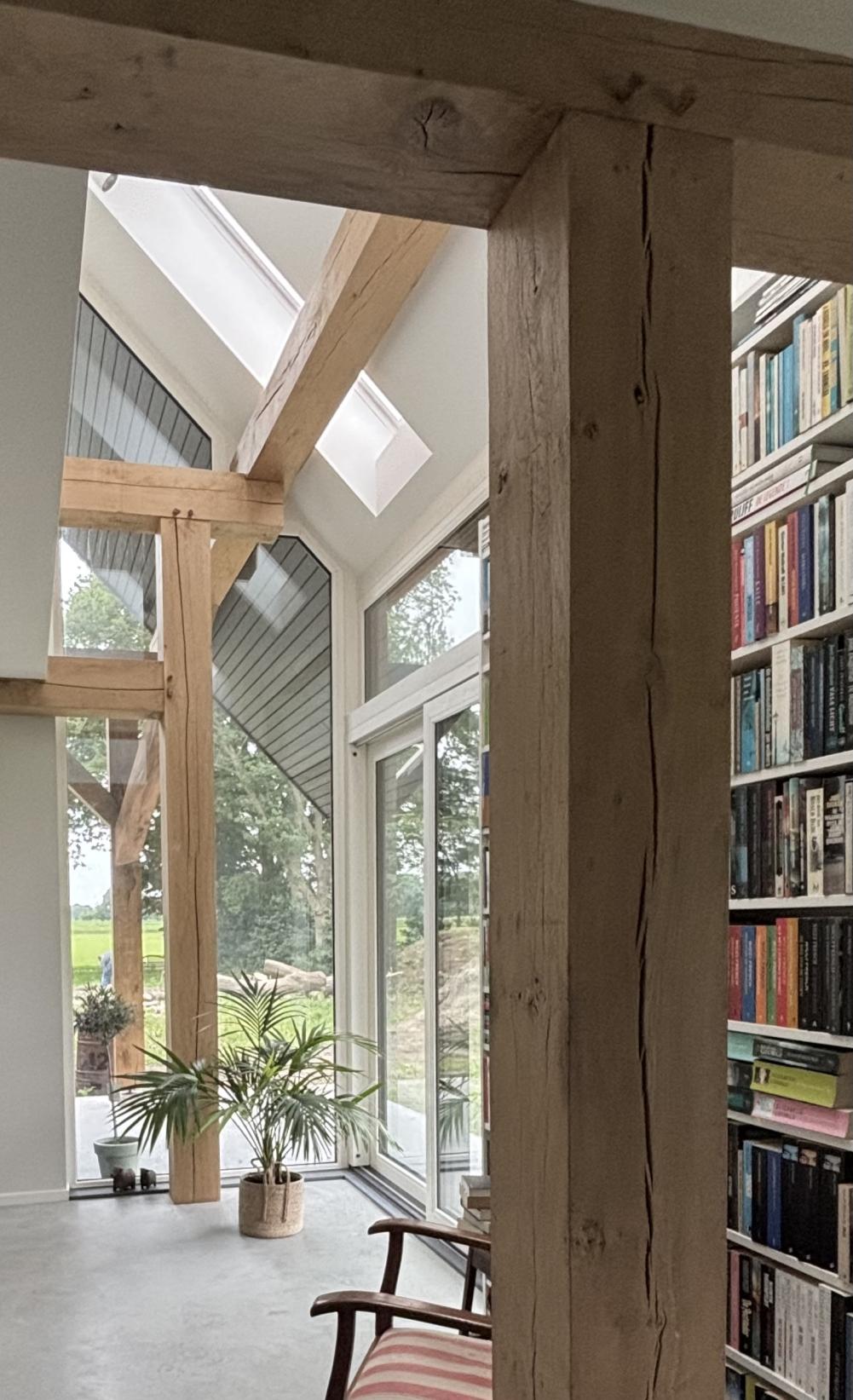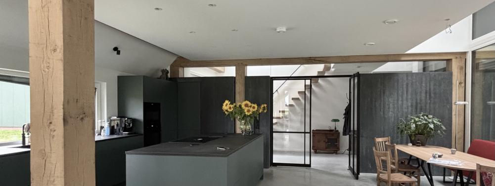 moderne schuurwoning met klassiek eiken gebint passend in drents dorp, gesloten schuur richting straat, langzaam openend naar het fraaie landschap aan de tuinzijde