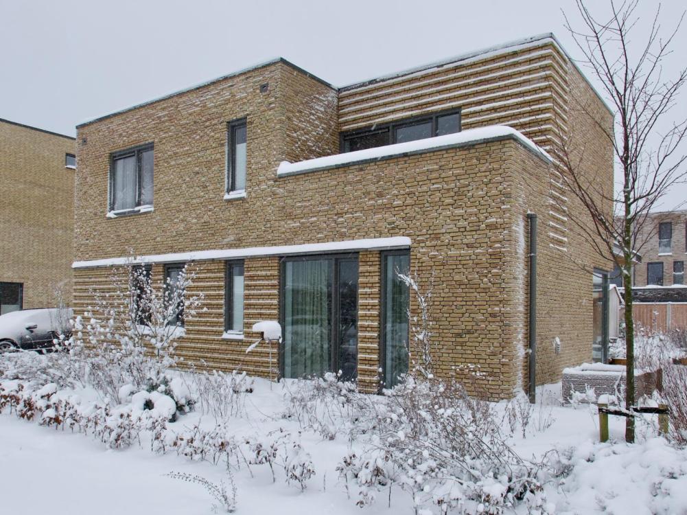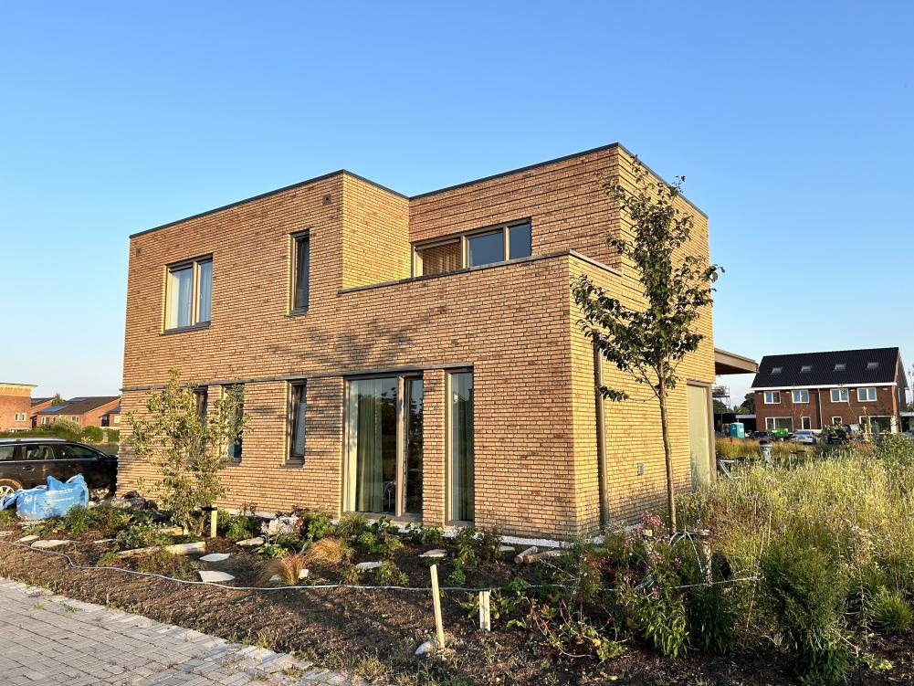 nieuwbouw woning in de wijk Kloosterakker te Assen. Het beeldkwaliteitsplan vroeg om een platte woning in 2 lagen met gevels in oker geel gekleurd metselwerk. De versprongen gevels geven het ontwerp een krachtige uitstraling, waarbij door middel van verspringende lagen metselwerk de accenten nog extra zijn uitgelicht. Door de hoge dakrand zijn de PV panelen uit het zicht gehouden. Het sedumdak boven de woonkamer vormt een mooie overgang tussen de woning en de tuin.